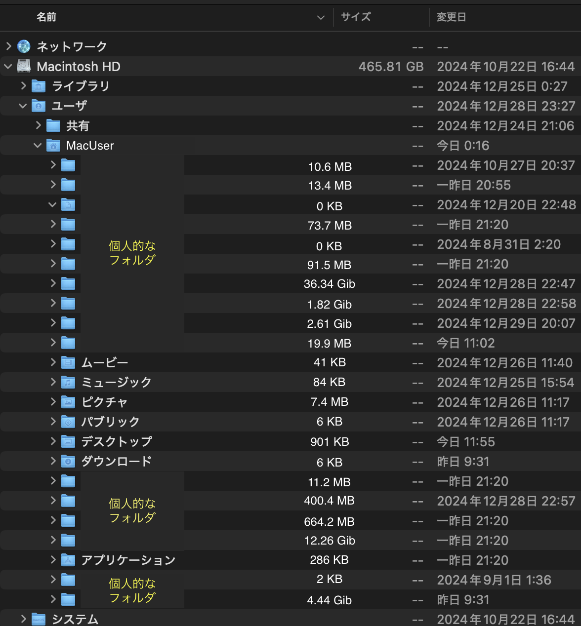 「MacUser」配下をフォルダごとにサイズを出してみると、 合計しても400Gibに満たないサイズでした。