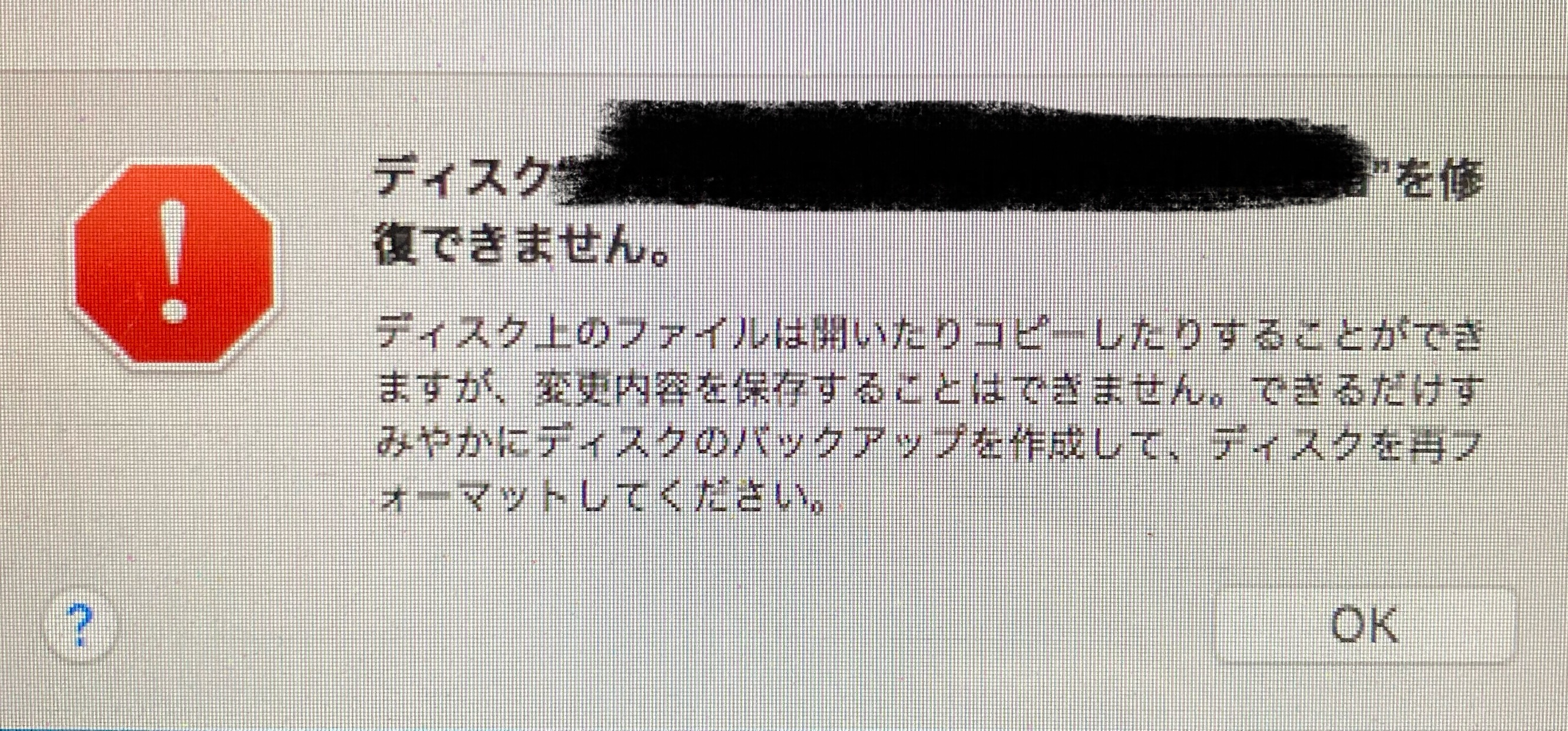 「ファイルシステムを検証または修復できませんでした」というエラーメッセージはファイルシステムが壊れているときに表示されるようです。