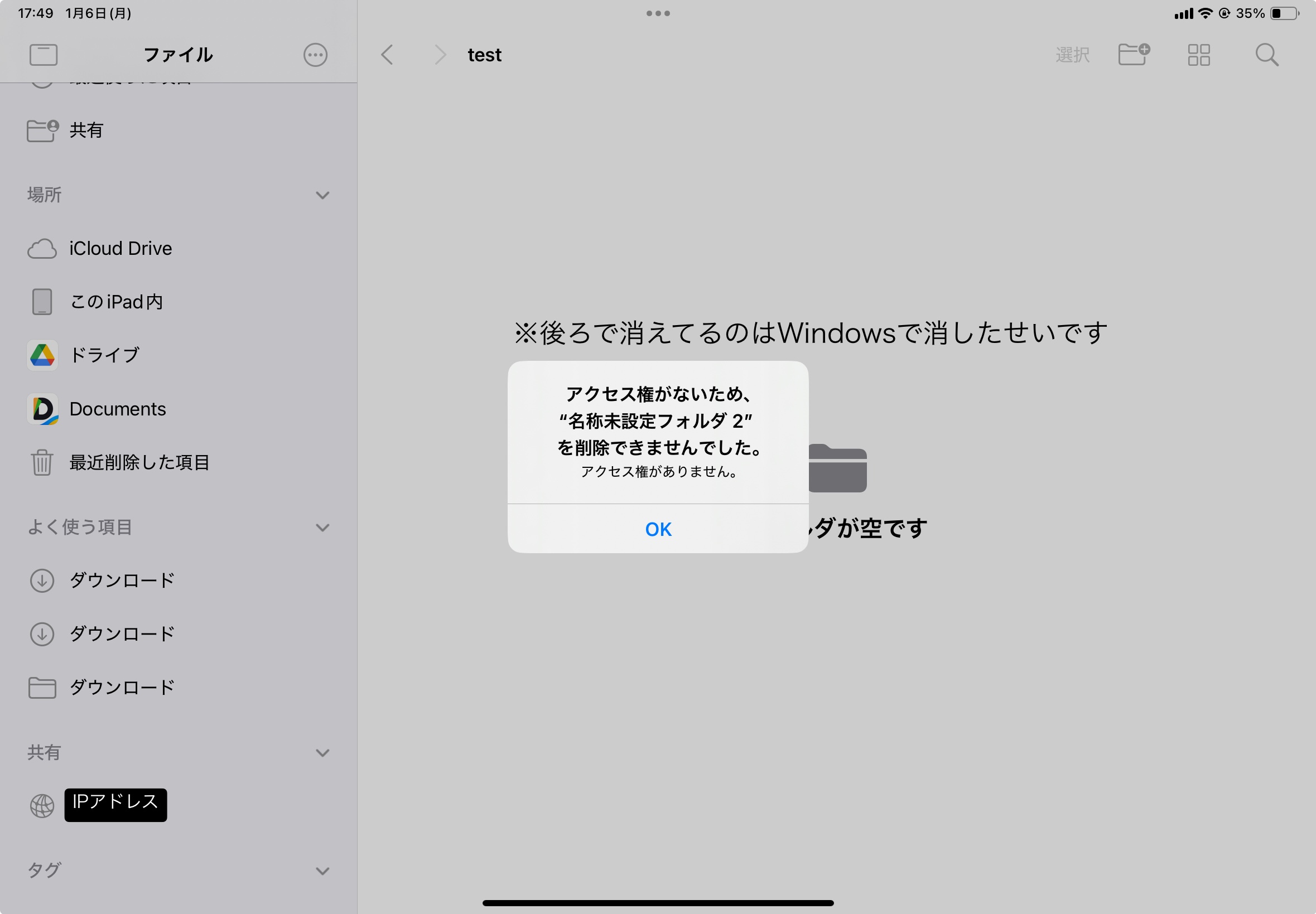 現在、Windowsから共有してIPアドレスで使ってみたのですが、一度入れたファイルが、