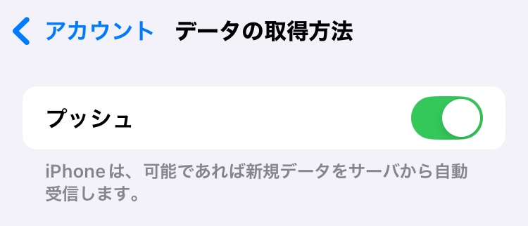 設定アプリ>アプリ>メール>メールアカウント>データの取得方法>プッシュ>「オン」