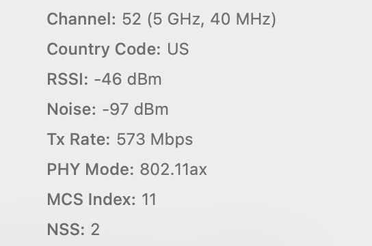 メニューバーのWiFiアイコンをOptionキーを押しながらクリックすると、接続しているWiFiのChやノイズ、RSSI等の情報が見られますが、その情報をここに転記してみては?