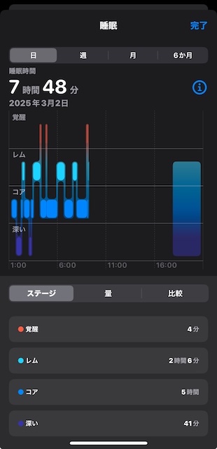AppleWatchSEを付けて昼寝をしたところ、睡眠自体は検知されているものの、睡眠ステージが記録されませんでした。(写真右部)
