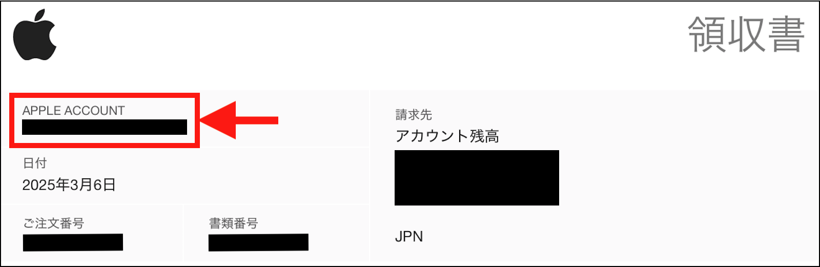 もし、「購入履歴」に当該の請求項目が表示されないが、Apple から 当該の請求項目の「領収書」メールが届いてい場合は、現在サインインに使用されている Apple Account と、「領収書」メールに記載されている「Apple Account(下の画像赤枠部分)」が同じかどうか確認 して見て下さい。