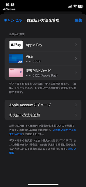 ただApple Payも追加されているのでそちらのデフォルト支払いの方が優先されますね。