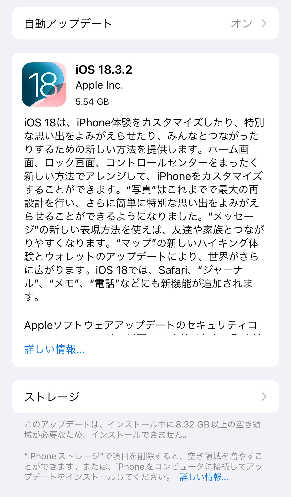 「このアップデートは、インストール中に8.32GB以上の空き容量が必要なため、インストールできません。」と表示されます。しかしながら、現在使用中のiPhone12のストレージ容量はこれを満たしており(8.32GB以上の空き容量がある状態であり)、この画面から進めません。1週間ほど待ってみたり、再起動をしたり、アプリの再起動をしたりと試行錯誤しましたが、状態が変わりません。解決方法が分かる方、よろしくお願いします。