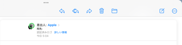 受信したメールアドレスがApple系(*)又は@gmailでしたらデジタル署名が有効ですので「認証済みロゴ」が表示されるか、本文中にAppleに登録した名前が入っているかを確認。
