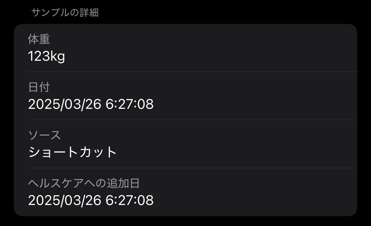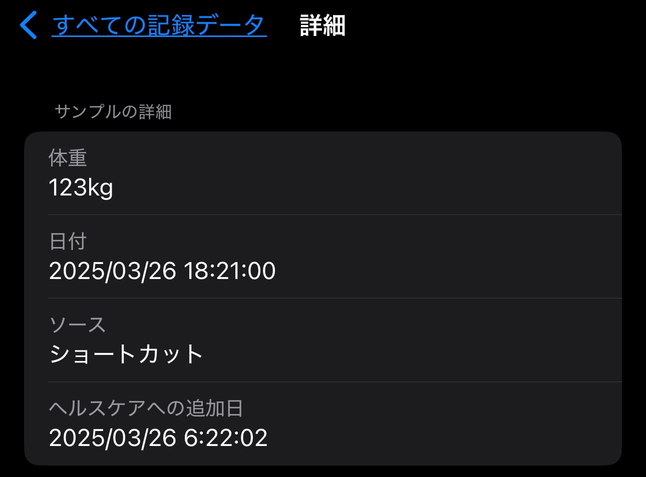 ショートカットで「ヘルスケアサンプルを記録」で、日付は「現在の日付」にすると、12時間早い時間で記録される。