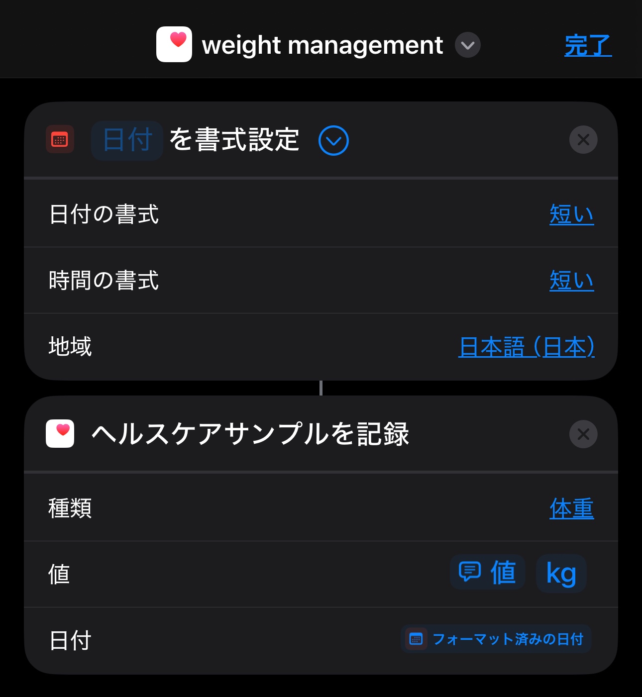 「ヘルスケアサンプルを記録」の前で「日付をフォーマット」する。