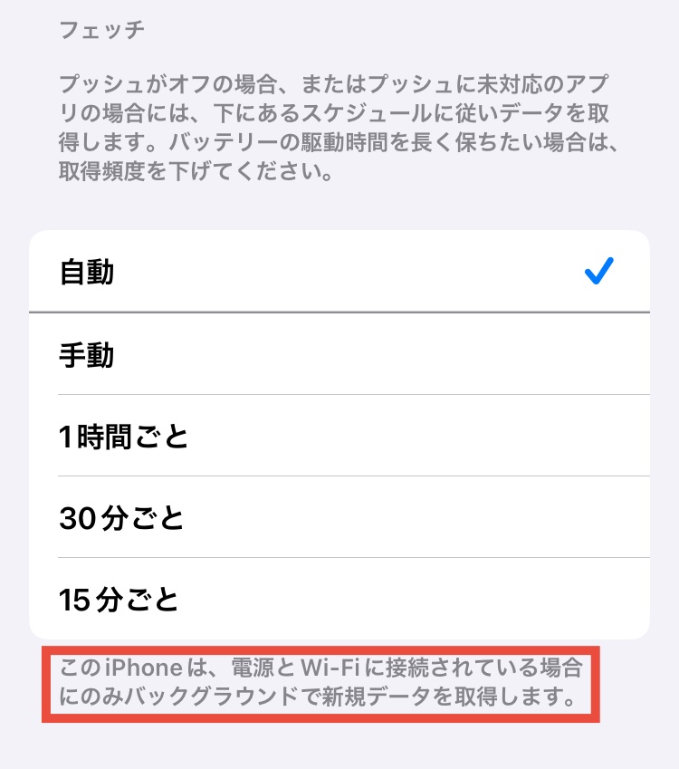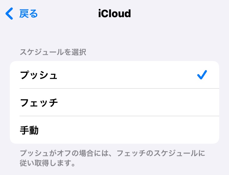 バッテリーの設定を低電力モードにしている。あるいは「データの取得方法>プッシュ」をタップすると、アカウントごとに「プッシュ」「フェッチ」「手動」とスケジュールの選択が出来ますが、そこがプッシュじゃないとか?