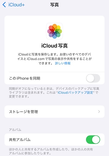 iCloudで写真を同期するとストレージがいっぱいになってしまうため、オフにしたいと思っています。