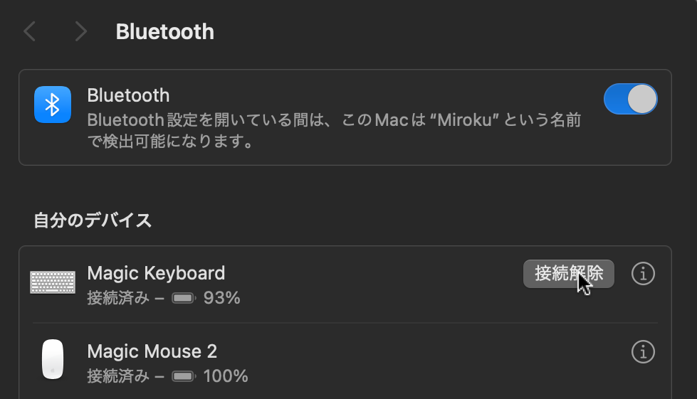 開発中のbluetoothデバイスとiphone16を接続したとき接続済みと表示されるのですが、iマークが表示されないためデバイス登録解除できません。