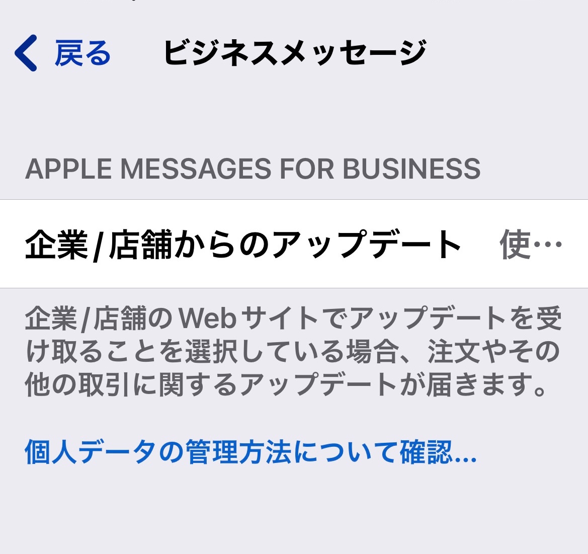 設定-アプリ-メッセージのビジネスメッセージ-企業/店舗からのアップデートをオンにしたいのに押せない状態です。