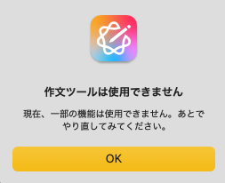 メモでは一時的に作文ツールのメニューが開くものの、添付画像のように何をしても使えないエラーメッセージが出る。スティッキーズに至っては、右クリックで作文ツール関連のメニューを開こうとしてもそもそも何も起こらないという状態になっている。