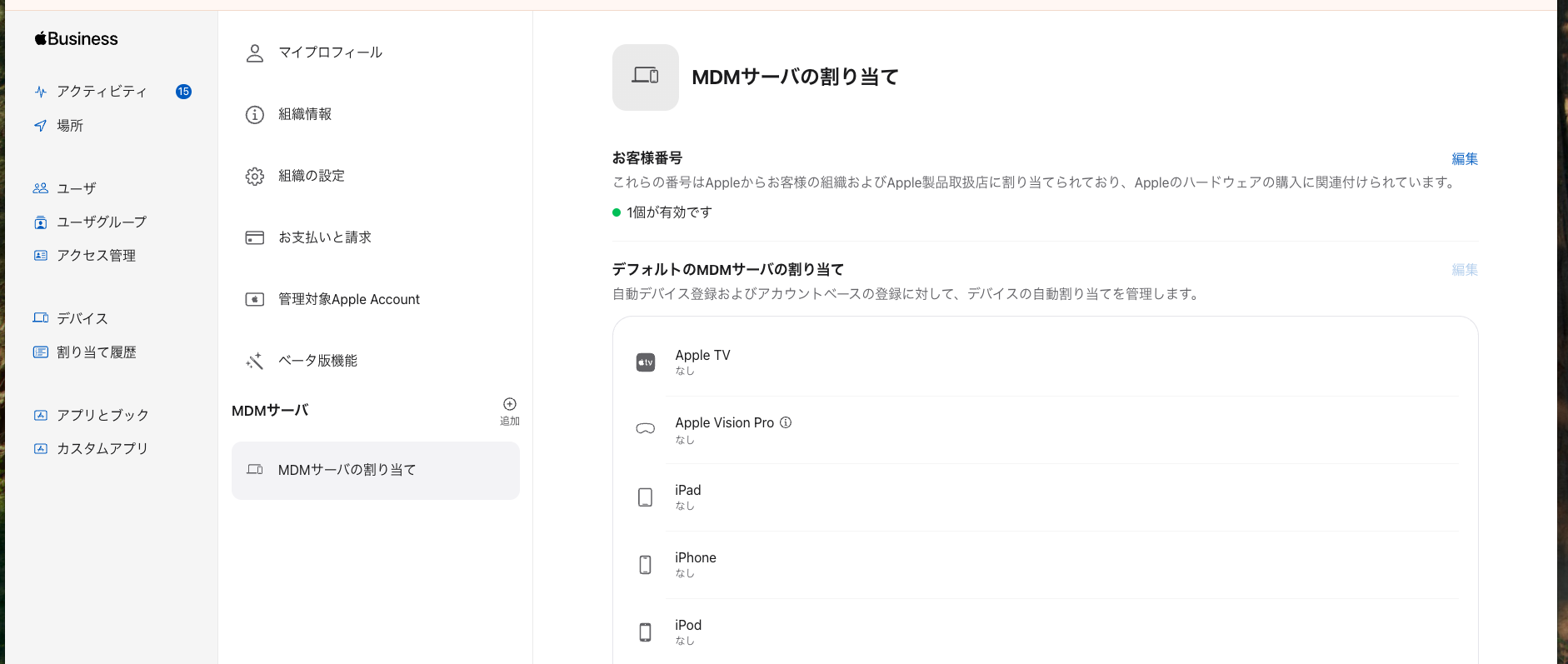 管理コンソールで「左下の指名アイコン」→「環境設定」→「MDMサーバの割り当て」→「お客様番号は入力済み(有効済み)」