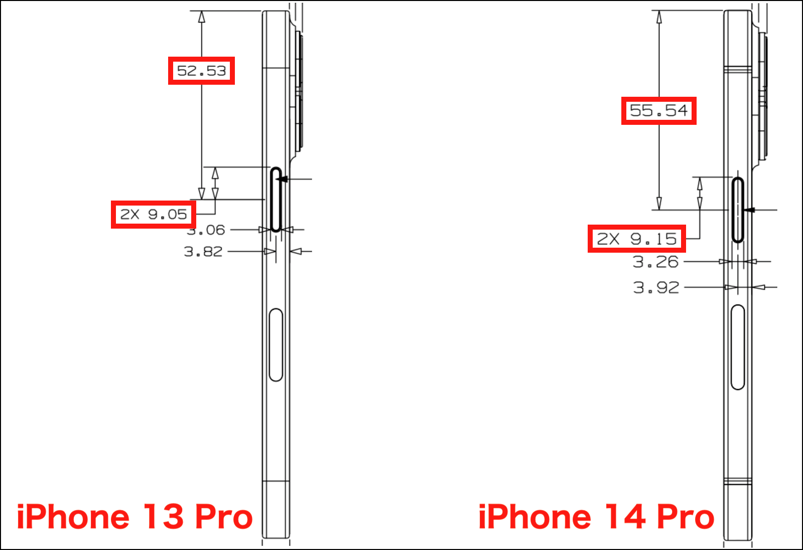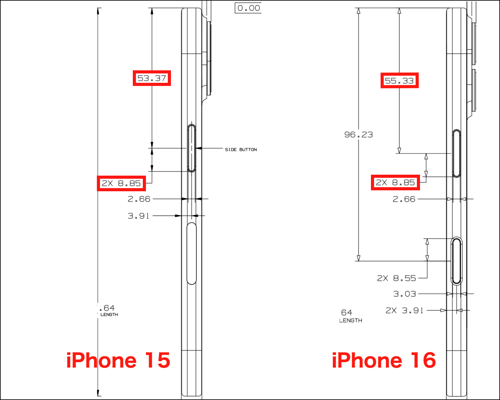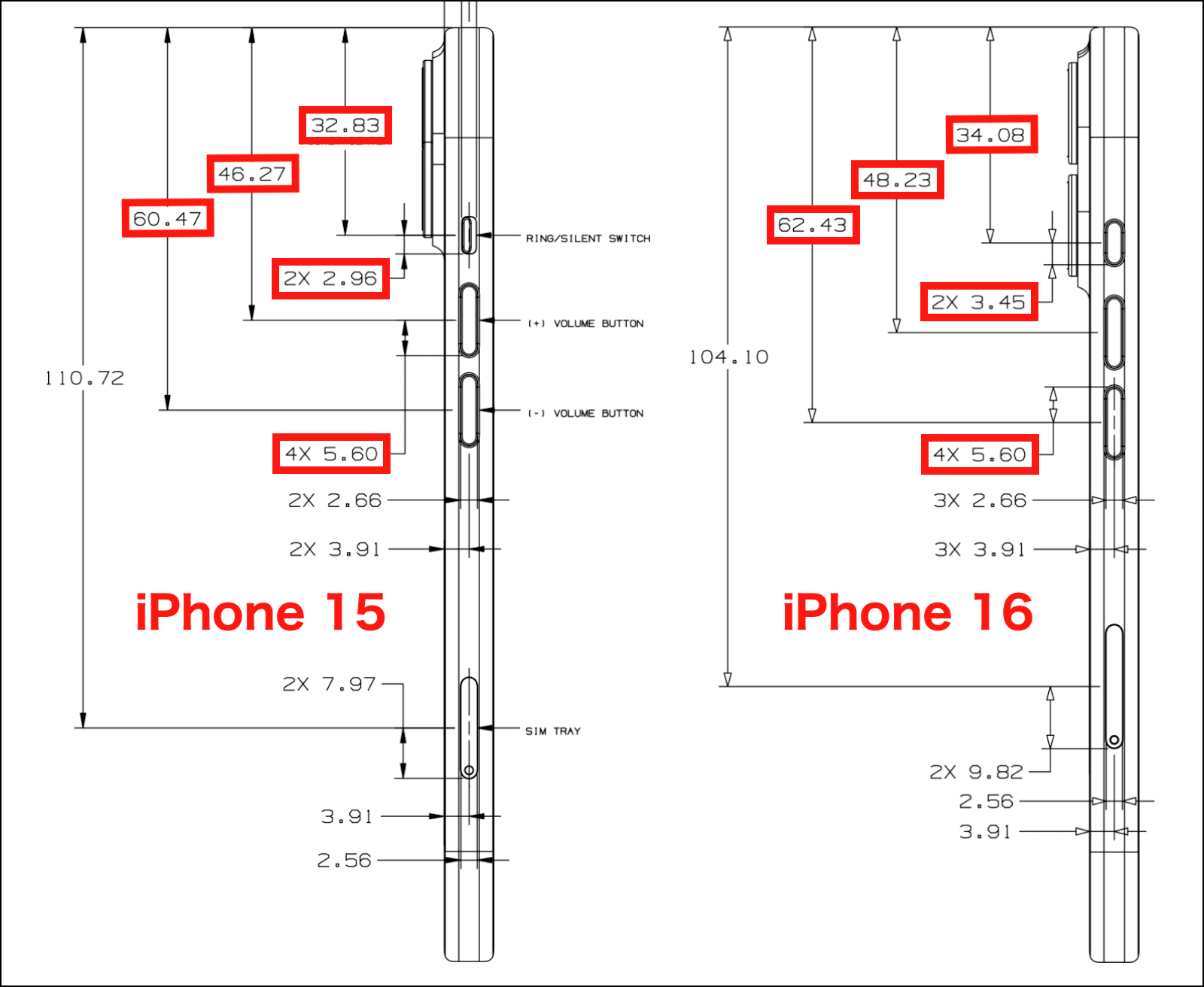 しかし、iPhone 15 と iPhone 16 では、下の画像の様に スイッチやボタン類の位置が異なっている為、iPhone 15 の着信/サイレントスイッチの上端部分が 0.76 mm 干渉、音量(+)ボタン及び音量(ー)ボタンの上端部分が 1.96 mm 干渉 します。