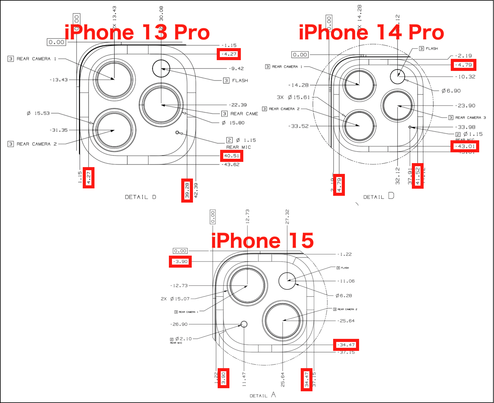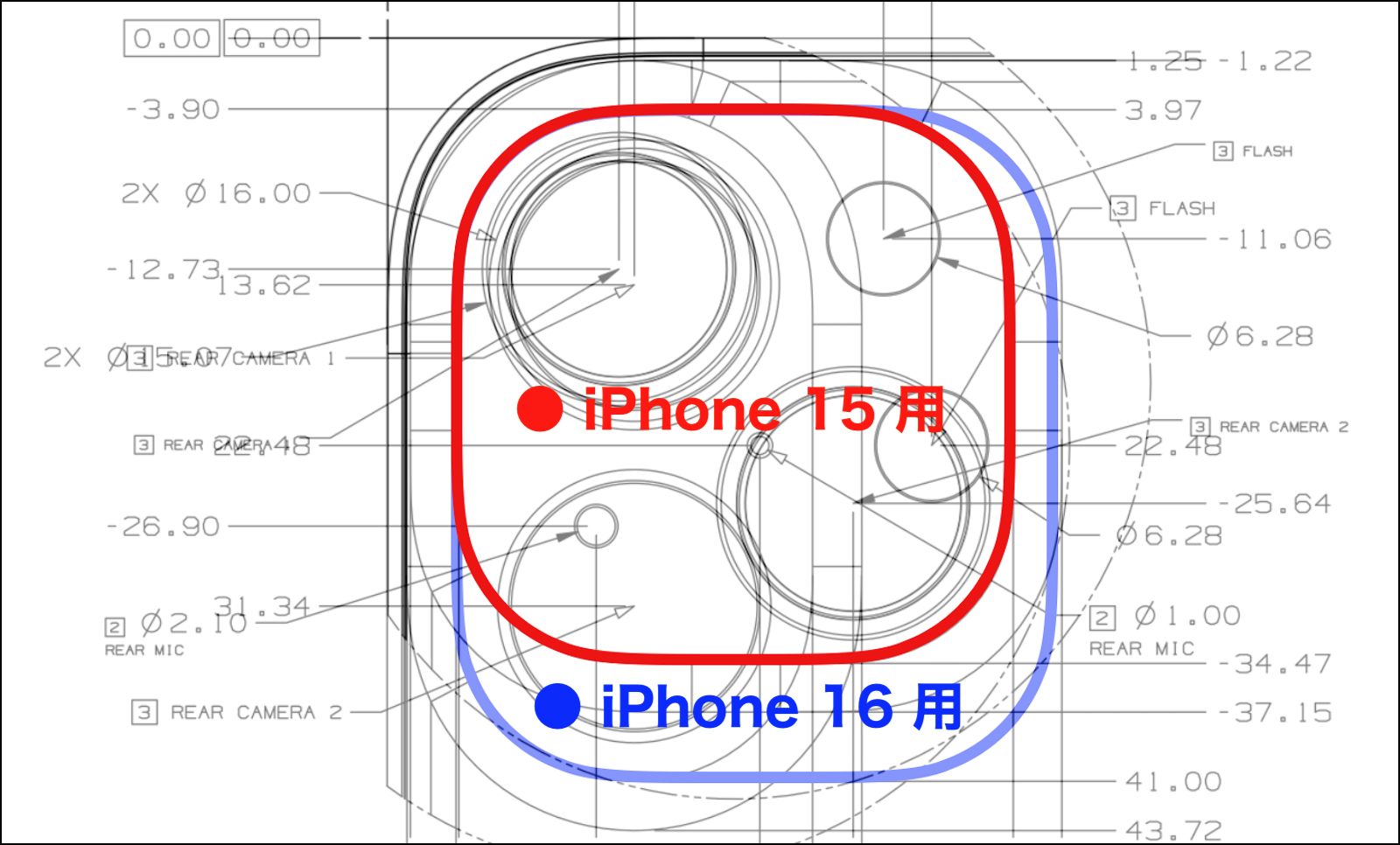 念の為、iPhone 13 Pro 用及び iPhone 14 Pro 用についても確認して見ましたが、iPhone 13 Pro 用ウェーブ シリコンケースの場合、背面カメラの窓と iPhone 15 の背面カメラの上端及び左端が、0.37 mm 干渉 します。