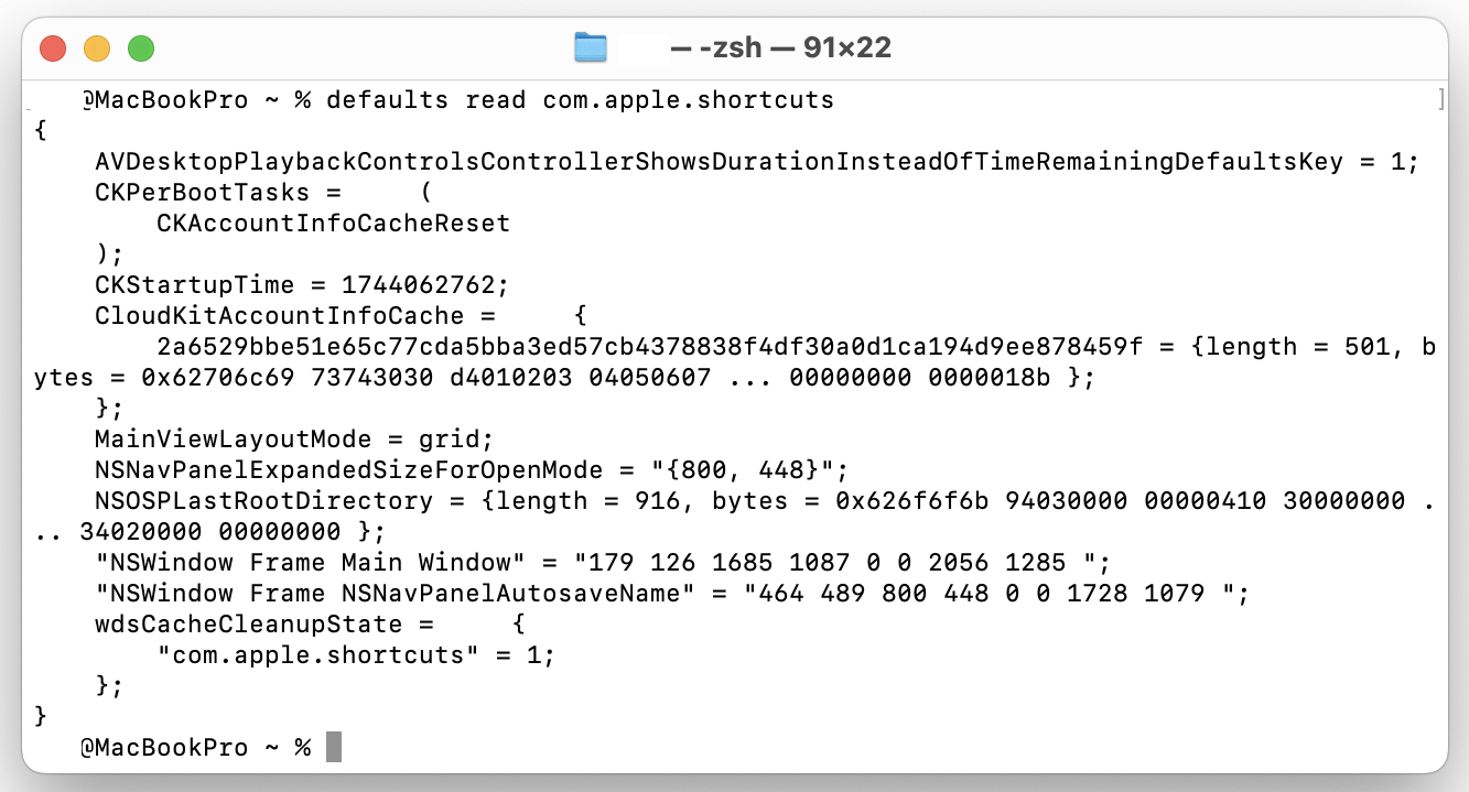 >ターミナルでdefaults read com.apple.shortcutsと打ち込んでもウインドウ情報どころかほとんど何も表示されませんね。