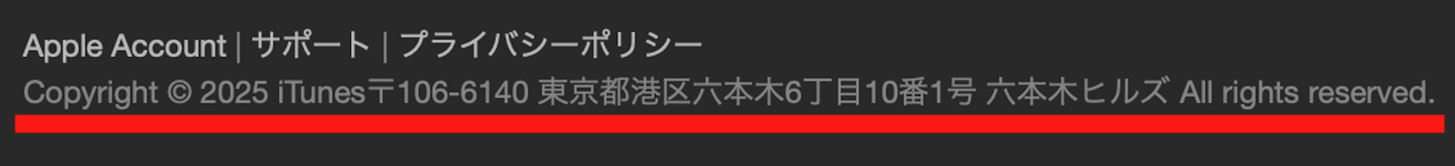 他にも、本物の Apple からの Apple Account に関するメールの場合、コピーライトは下の画像の様に、 「Copyright © 2025 iTunes〒106-6140 東京都港区六本木6丁目10番1号 六本木ヒルズ All rights reserved.」ですが、当該のメールでは全く異なる物になっている時点で、偽メールと分かります。
