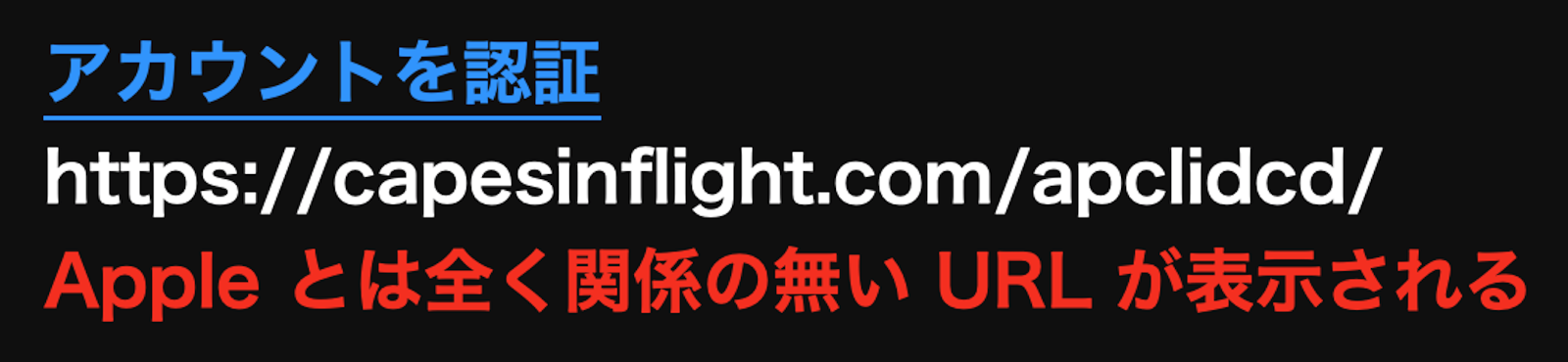 本来、Apple Account アカウントのページのリンクは、下の画像の様に URL で表示され、リンクにマウスポインタ(Mac の場合)や指(iPhone や iPad)を重ねる(クリックやタップしないで下さい)と表示される URL は、「https://account.apple.com/」になります。