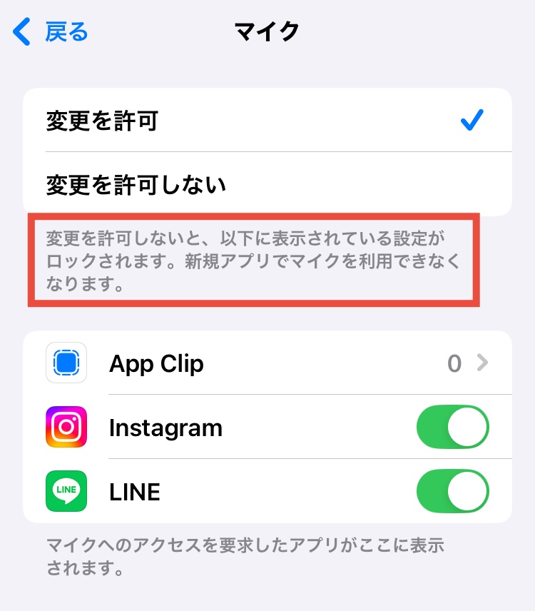 もし、スクリーンタイムを利用しているのなら、設定アプリ>スクリーンタイム>コンテンツとプライバシーの制限>許可されたアプリと機能、マイク>「変更を許可」の設定は確認してみましたか?