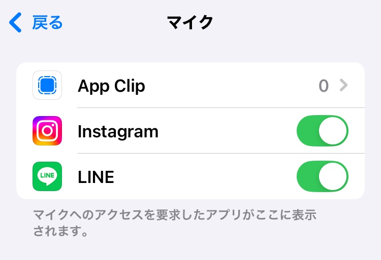 設定アプリ>プライバシーとセキュリティ>カメラ、マイク>Instagram、LINEの項目がないのでしょうか?