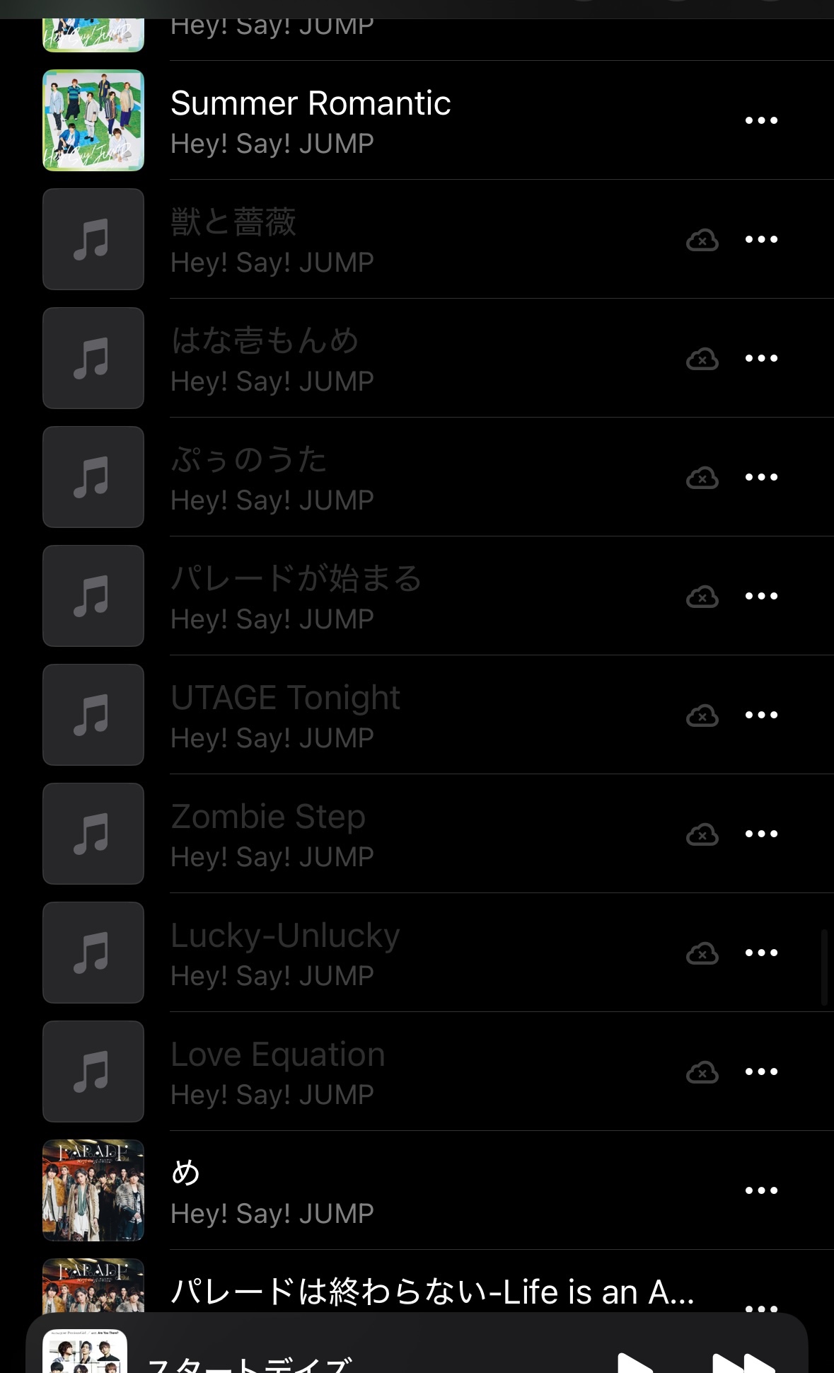 AppleMusicでHey! Say! JUMPのプレイリストを作ったのですが、いざプレイリストを聴こうとするとHey! Say! JUMPの特定のアルバムの曲全てと、他のアルバムからの何曲かが再生出来ず、PCとのライブラリ同期を求められる表示になります。