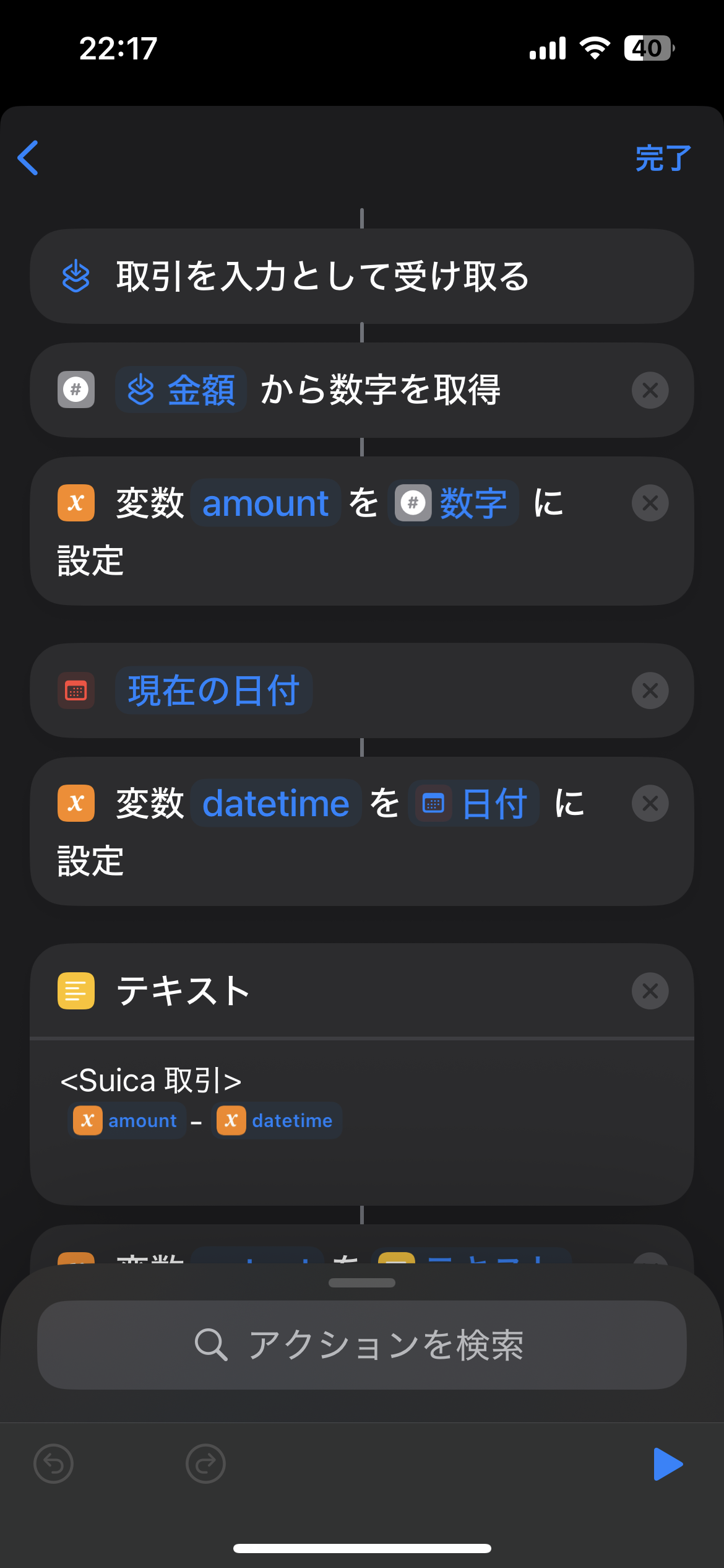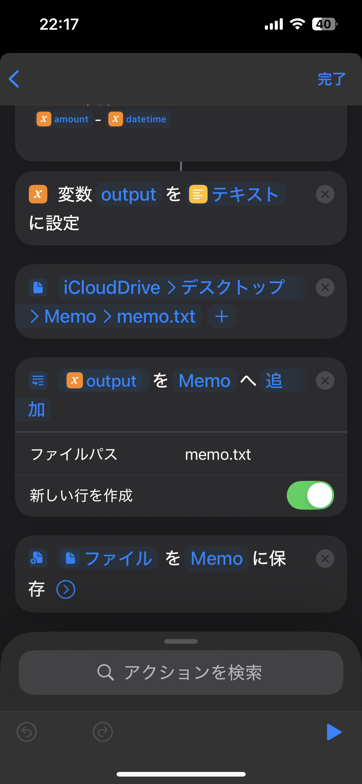利用時の取引金額をicloudにあるテキストファイルに書き込みするようなオートメーションを作りました。