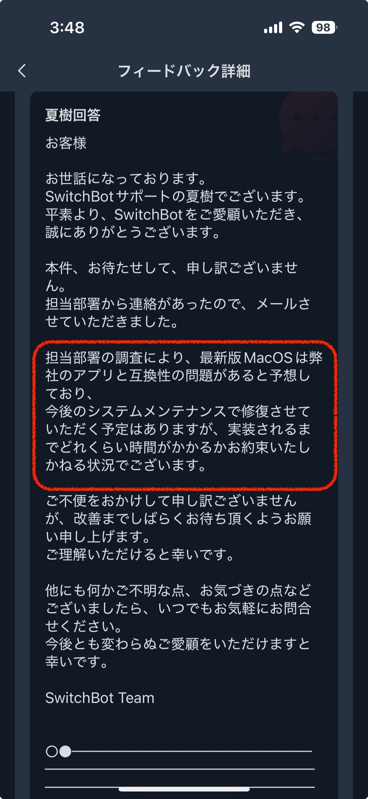 Switchbotアプリはインストールに関して特別なことは特にしておらず、他のアプリと同じくAppStoreからダウンロードして使用できている状況です。そのため、動作しない原因は不明です。