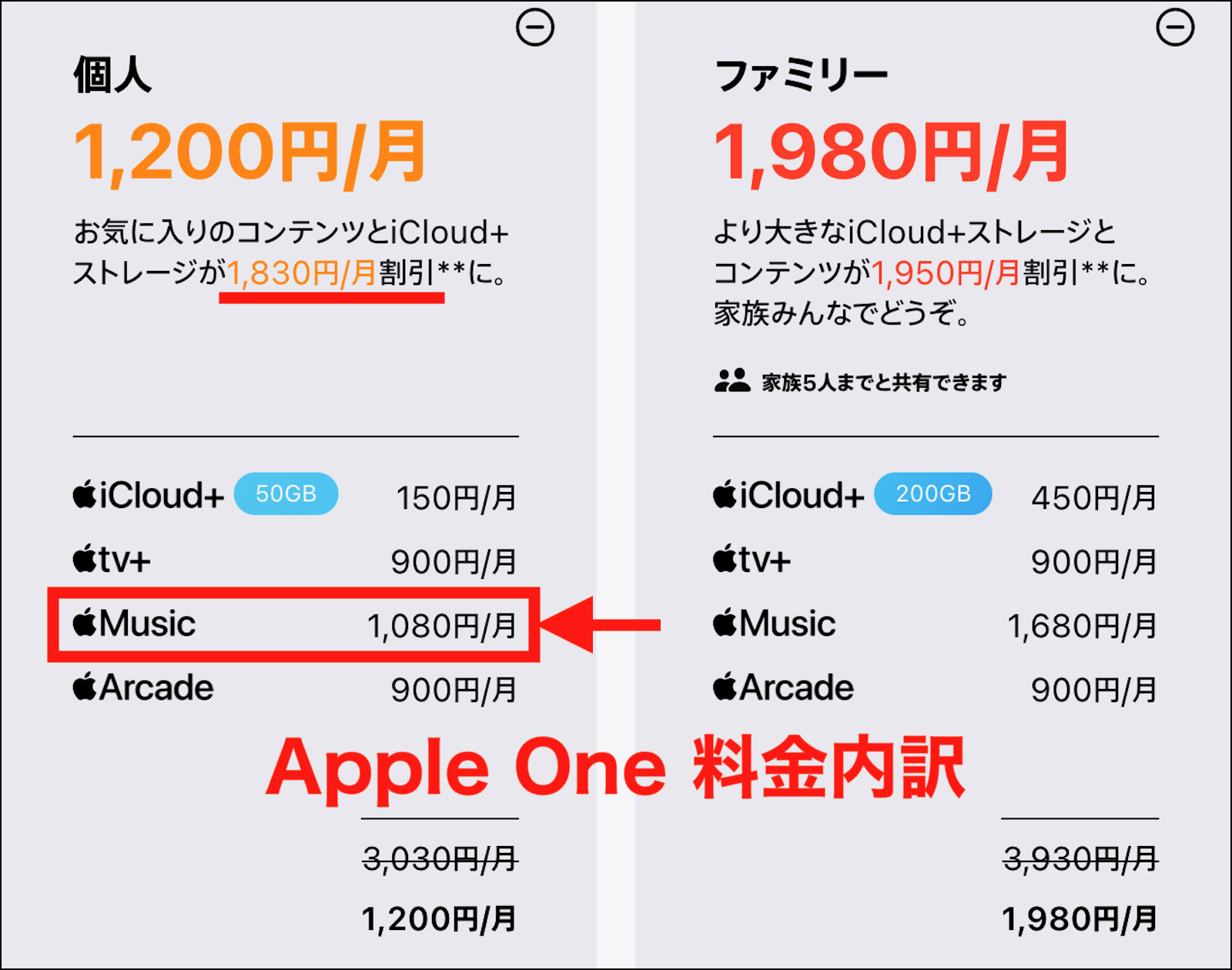 (Apple One の料金の内訳を見ても、下の画像の様に Apple Music 個人プラン(1,080 円/月)になっています)