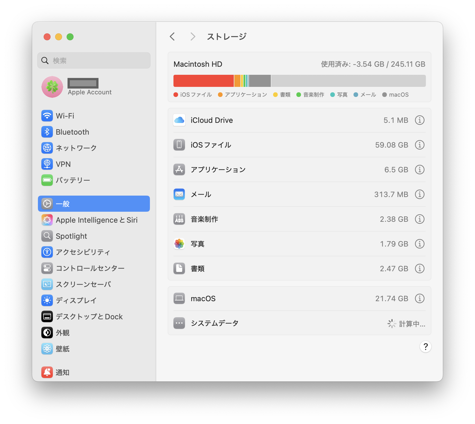 システム設定のストレージを確認すると「使用済み:-3.54GB/245.11 GB」となっており、システムデータの使用量が「計算中」のままとなっています。