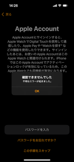Apple Watch でwatchアプリからapple id にサインインしたいのですが、エラーが発生して出来ないです。