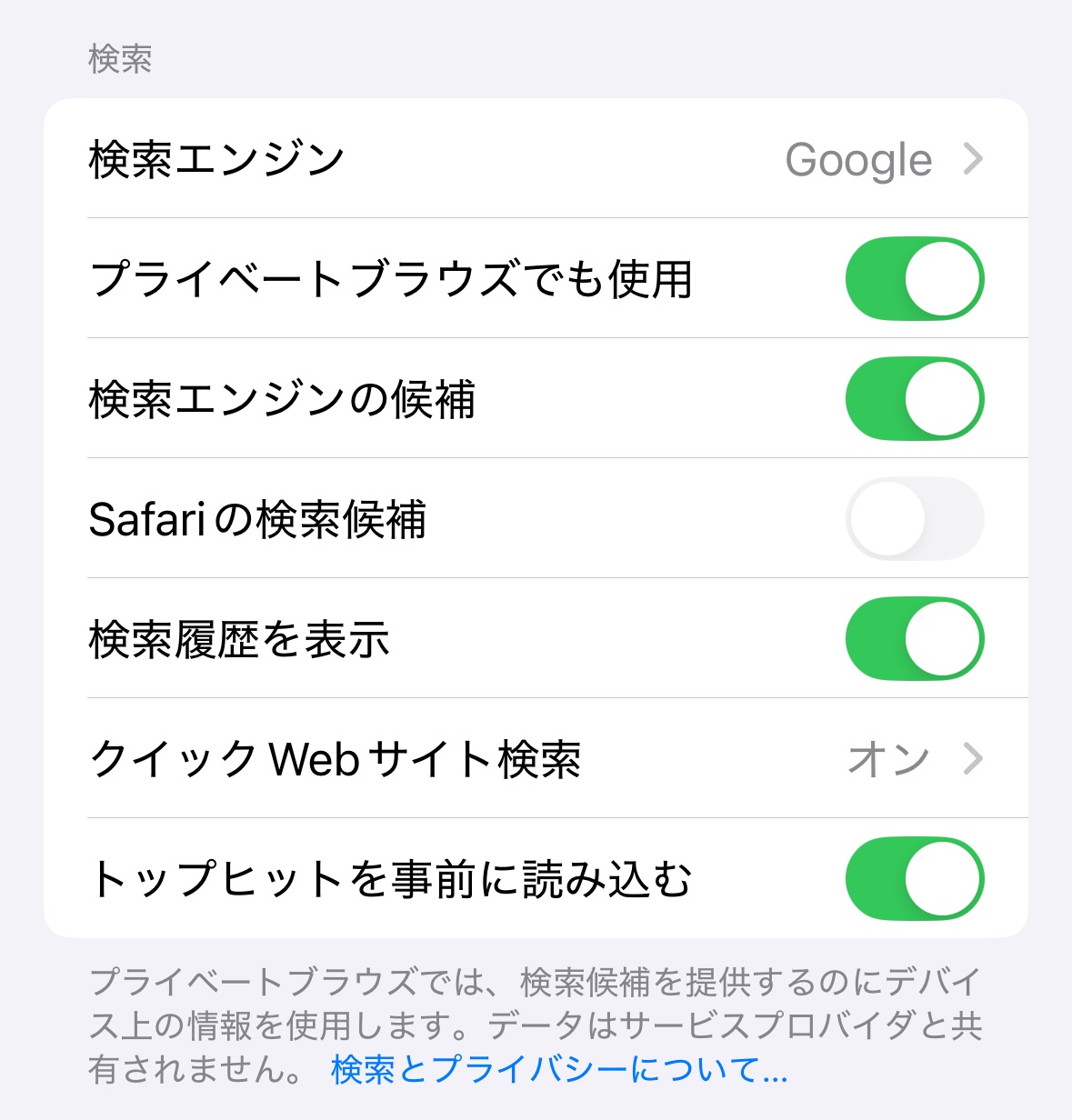 safariの検索候補のタブがグレーアウトしてオンにできなくなってます。