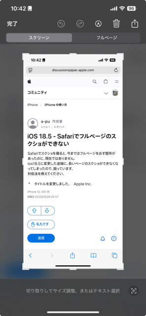 ios18.5に変更した途端に、長いページのスクショができなくなってしまったので、困っています。