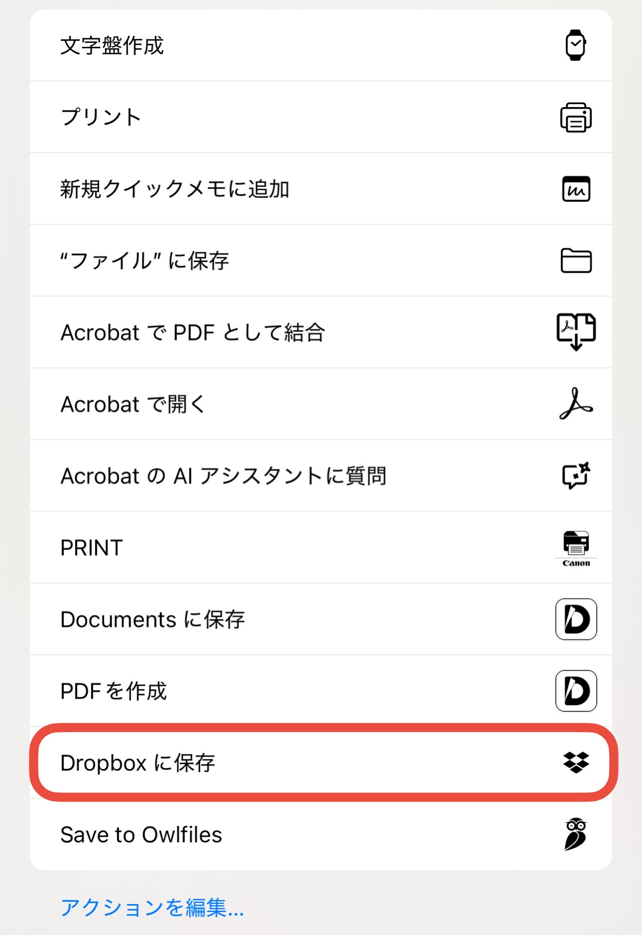 ユーザのユーザプロフィール: D300 D300 Community+ 2025 ユーザレベル: レベル 9 66,965 ポイント 2025/06/04 02:38 su_k への返信 写真アプリで写真を選択共有アイコンをタップ共有先リストの“Drooboxに保存“を選択 返信 リンク