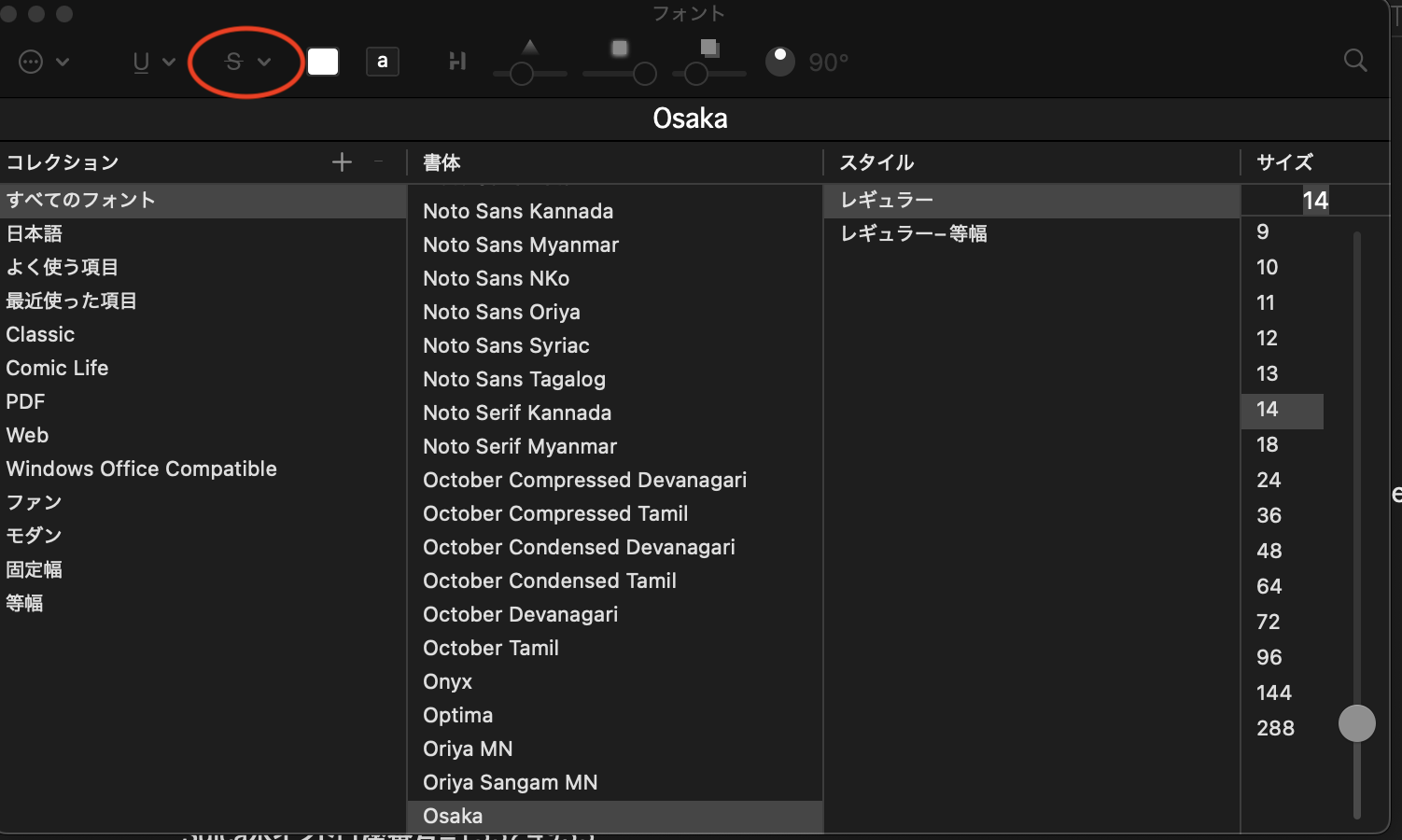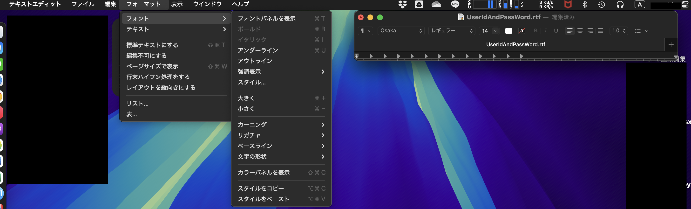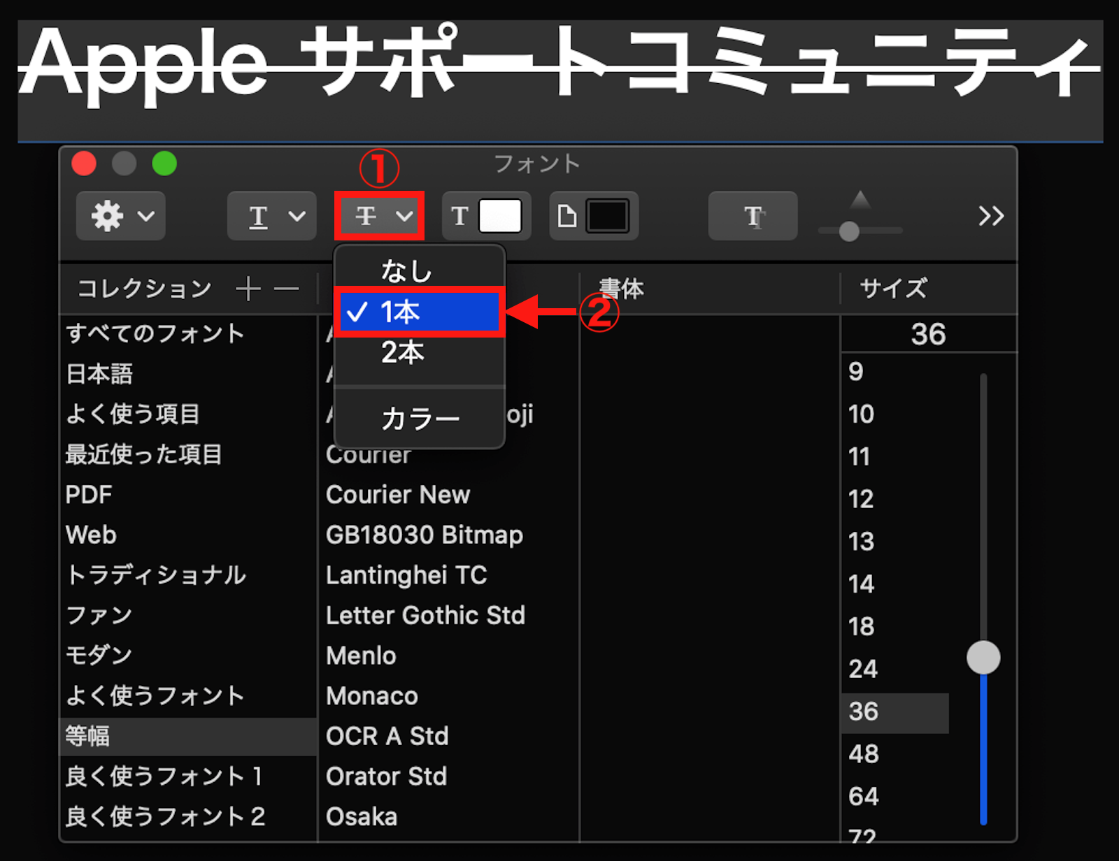 以下の環境で「テキストエディット」を使用していますが、テキストの取り消し線入力方法がわかりません。