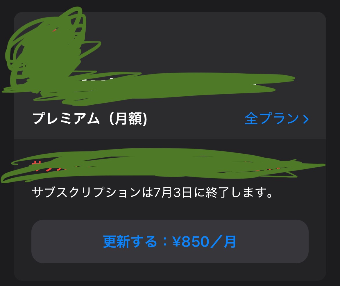 そしてこのサブスクリプションをそのまま続けたいのでしょうか。もしそうなら、現状では7月3日に終了してしまうので、「更新する」ボタンを押します。すると7月3日までの初月分(残高不足で払えなかった分)が引き落とされ、7月3日の更新日に次の分が引き落とされるだろうと思います。