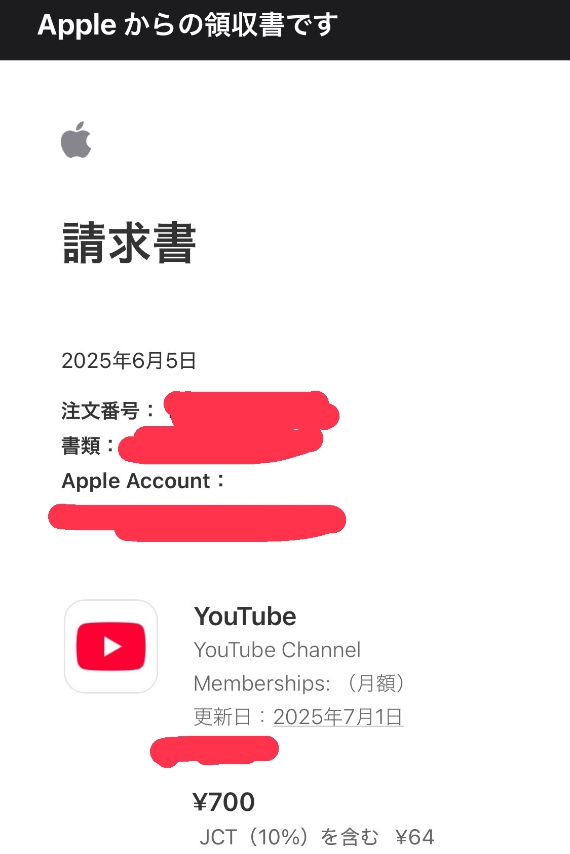 タイトルは「Appleからの領収書です」のままですが…