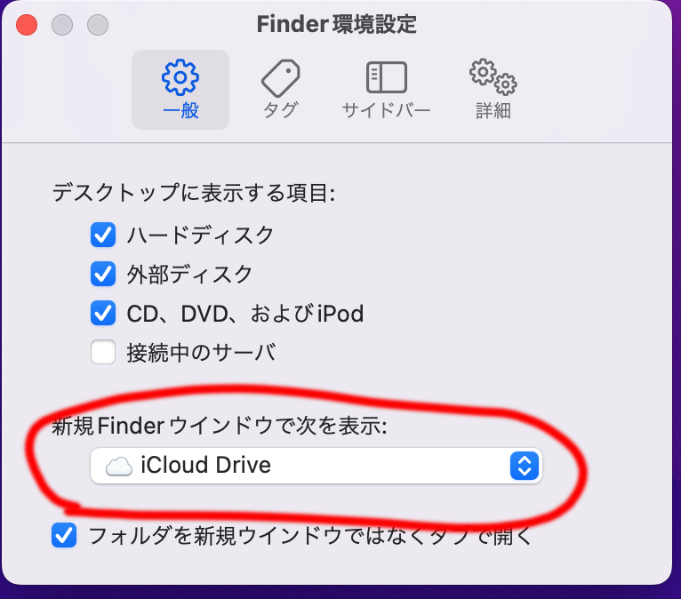 Finderの「設定」でiCloud Drive が指定できませんか?