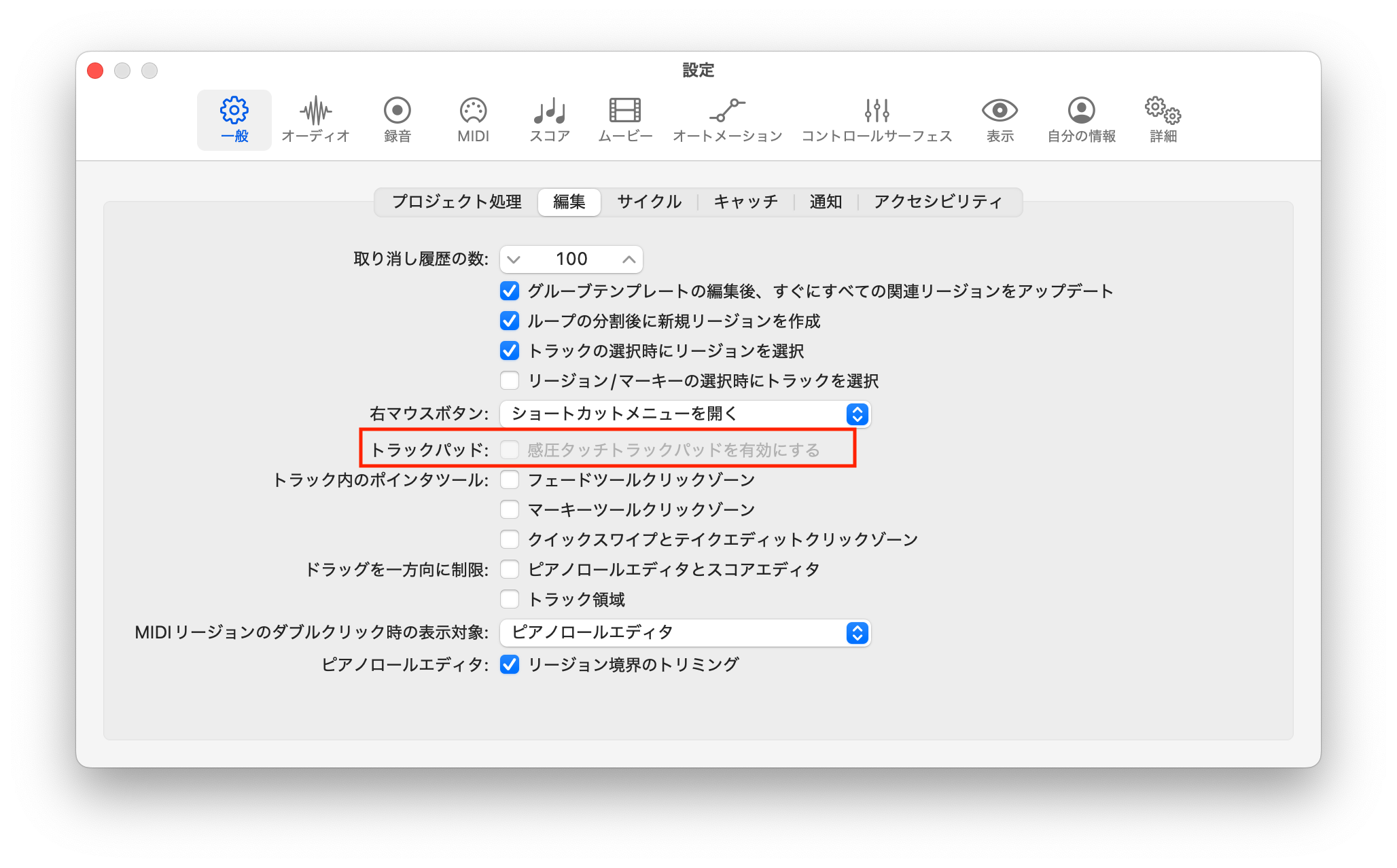 できなくなる前後でmacOSのバージョンアップもLogicProのバージョンアップも行なっていたため、どちらがきっかけになったのかはわかりません。もしかすると誤操作で設定が変わってしまった可能性もありますが、強クリックに関する設定項目を見つけることができませんでした。