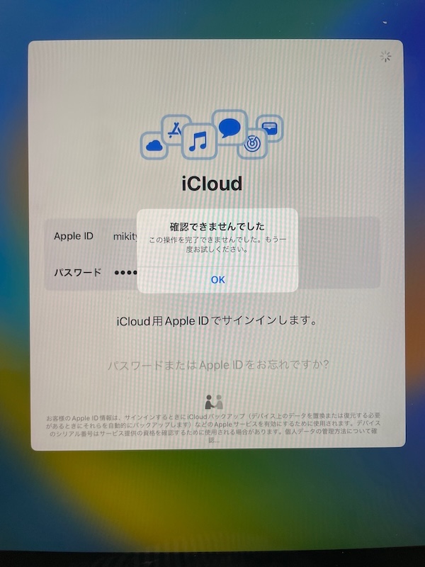 Appleアカウントとパスワードを入力して、それらが正しいにも関わらず確認できませんと言われるなら、そのデバイスにはアクティベーションロックがかかってる可能性が高いです。消去しただけの状態だと見かけは初期化されてるように見えますが、Appleアカウントを設定しようとするとエラーになって設定できません。