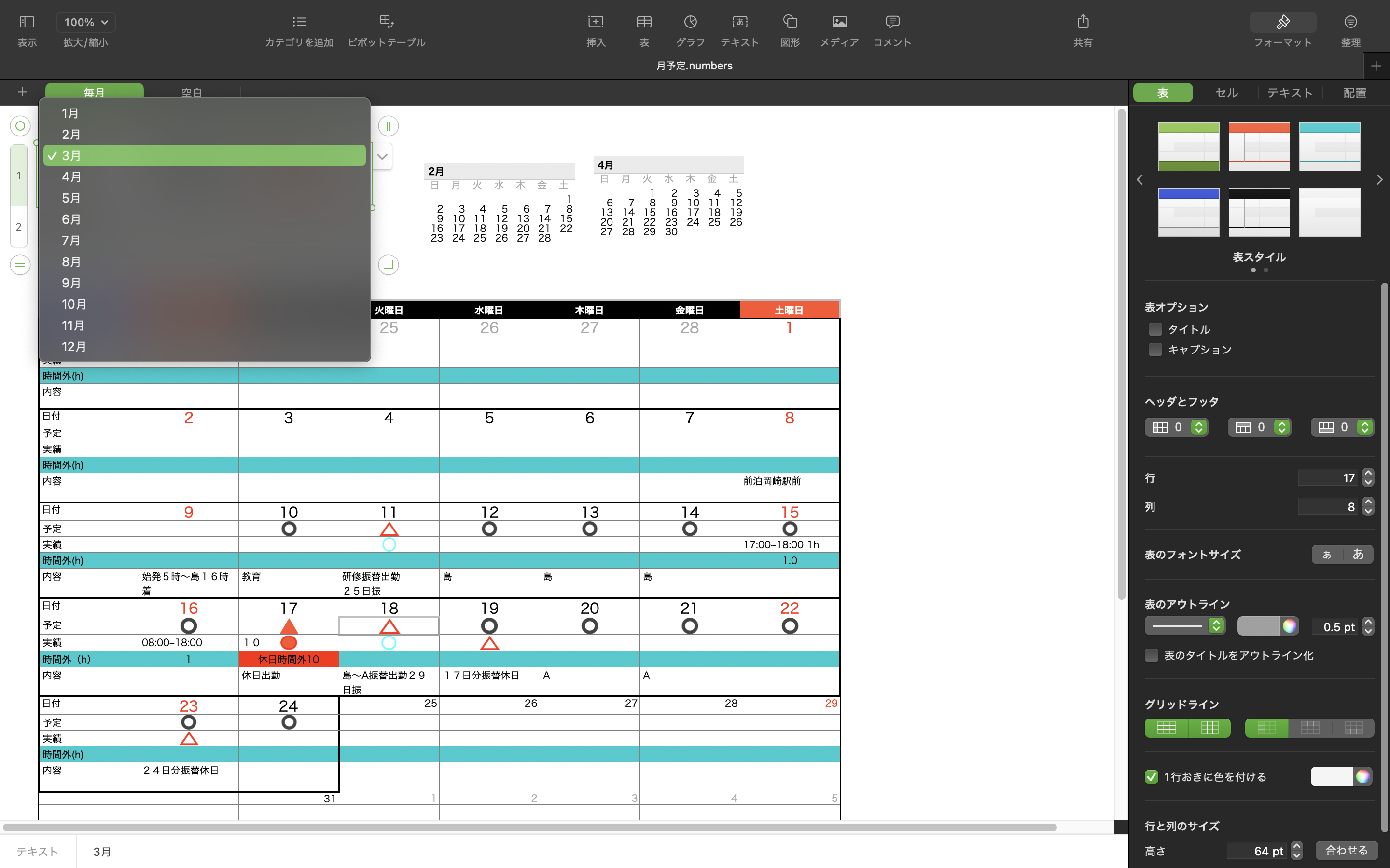 Numbersのテンプレートにあるカレンダーを使用し、月ごとの作成を行いたい