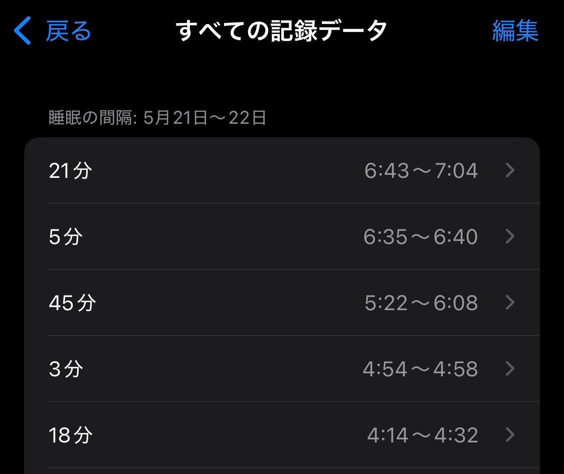 夜間睡眠時、アップルウォッチを装着しています。翌朝記録を見ているとレム睡眠などが記録されておらず、アップルウォッチのデータソースである「全ての記録データ」を確認したところ、21分、45分、3分……と途切れて記録されておりました。