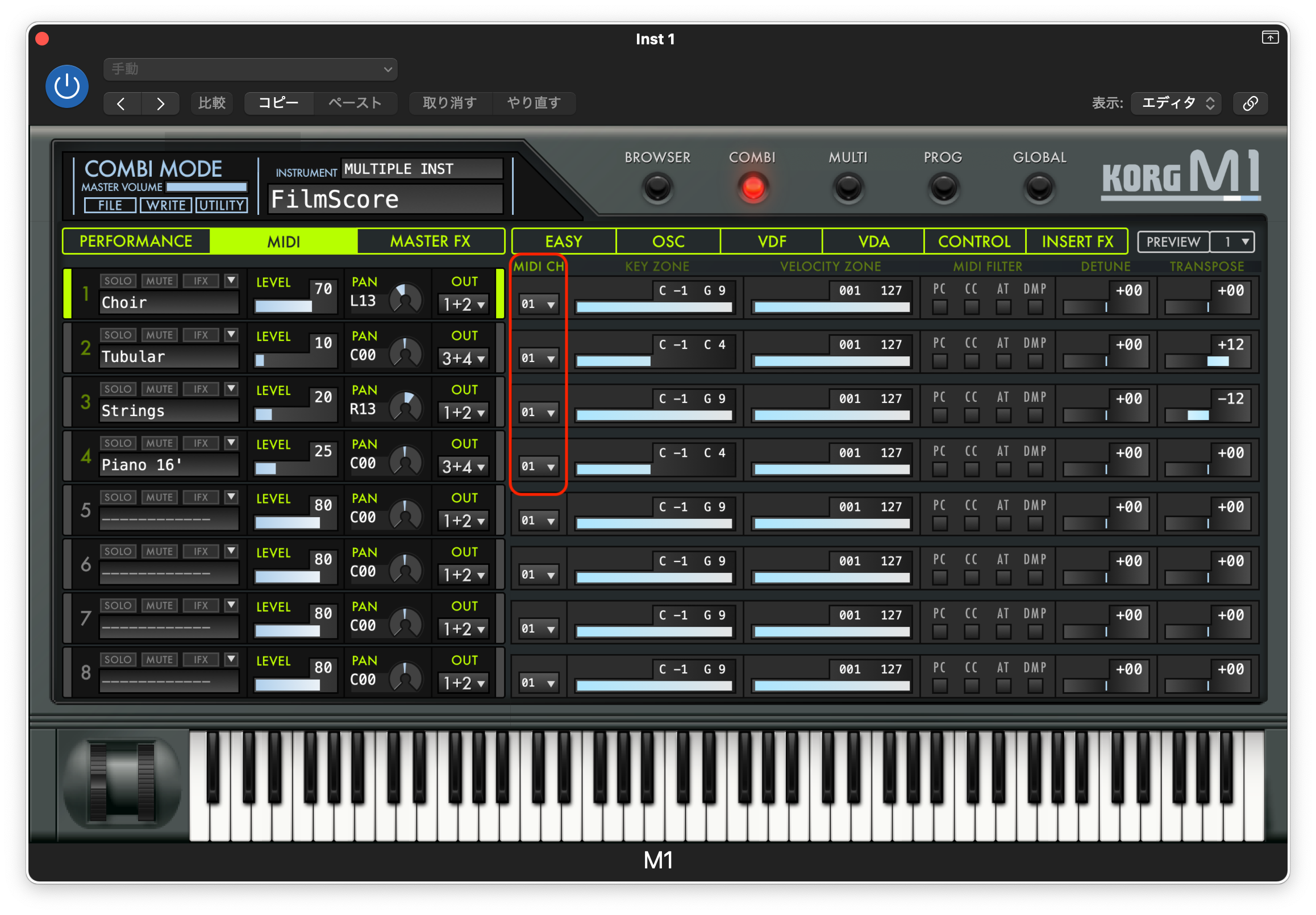 M1の”MIDI”をクリックすると各ティンバーのMIDI chの設定の様子が表示されますが,