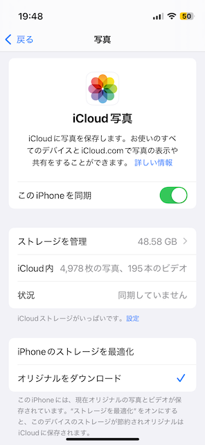 また、数日前に「iPhoneのストレージを最適化」から「オリジナルをダウンロード」に変更しました。このダウンロード状況は確認できるのでしょうか?ダウンロードが終わってから同期をオフにする必要があるのでしょうか?