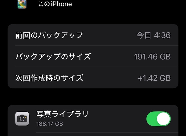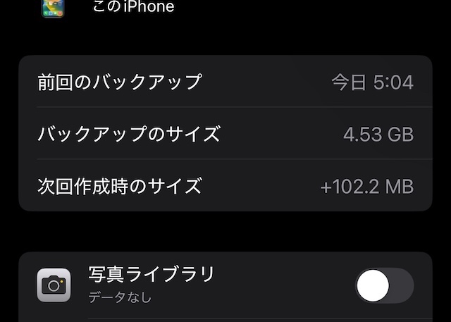 試しに写真ライブラリのバックアップをオフにしたところ次回サイズがかなり下がったので、写真が原因なのかなと思っています。