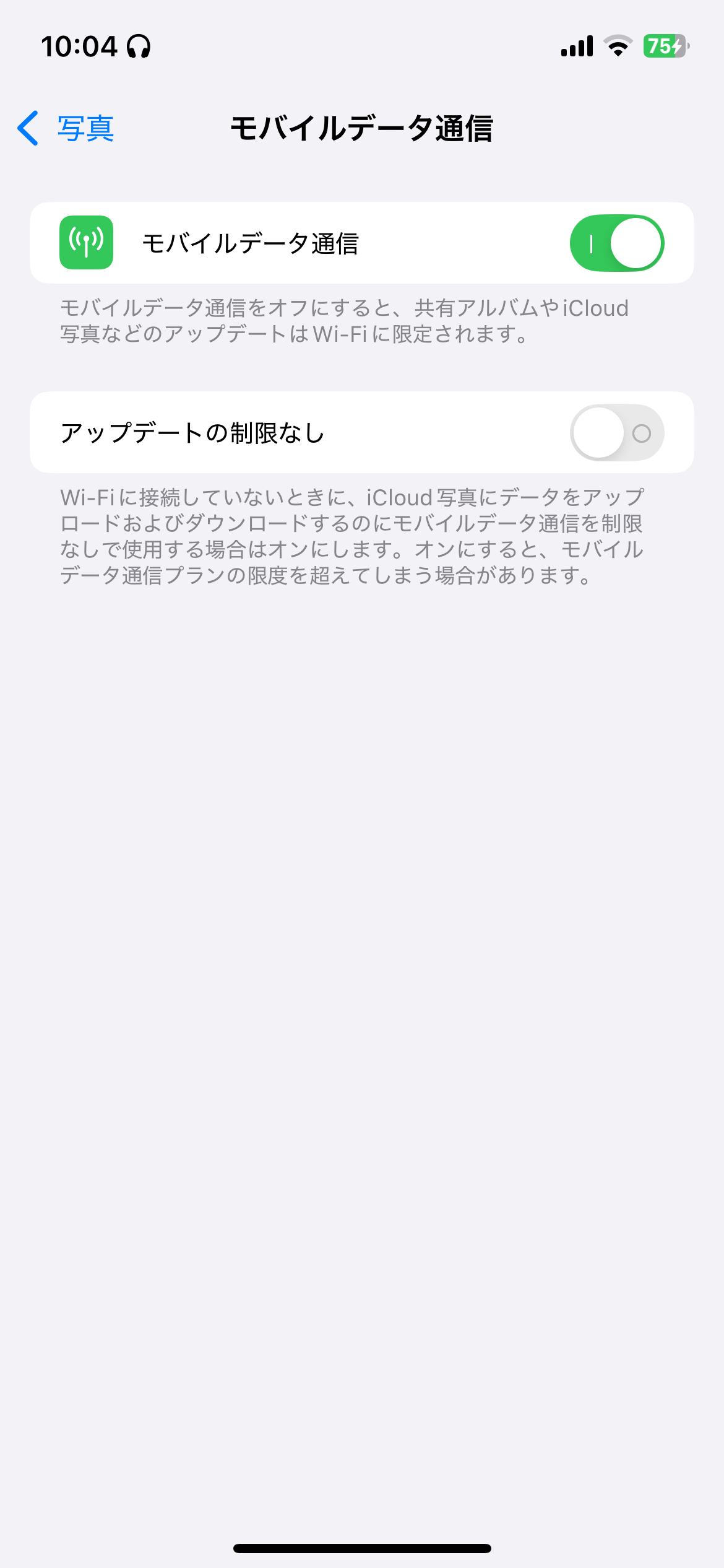 写真データのアップロードにモバイルデータ通信も使う設定になっていますね。