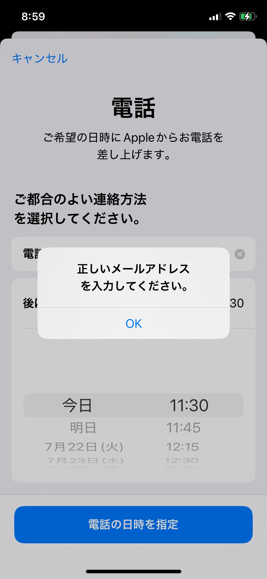 自分のAppleIDは、自身で取得したドメインのメアドで10年以上利用してるものですが、サポートアプリから電話サポートをうけるために日時指定で折り返し電話を貰えるように設定しようとすると以下のような画面がでて進めませんが何をどうしたらいいのでしょうか?