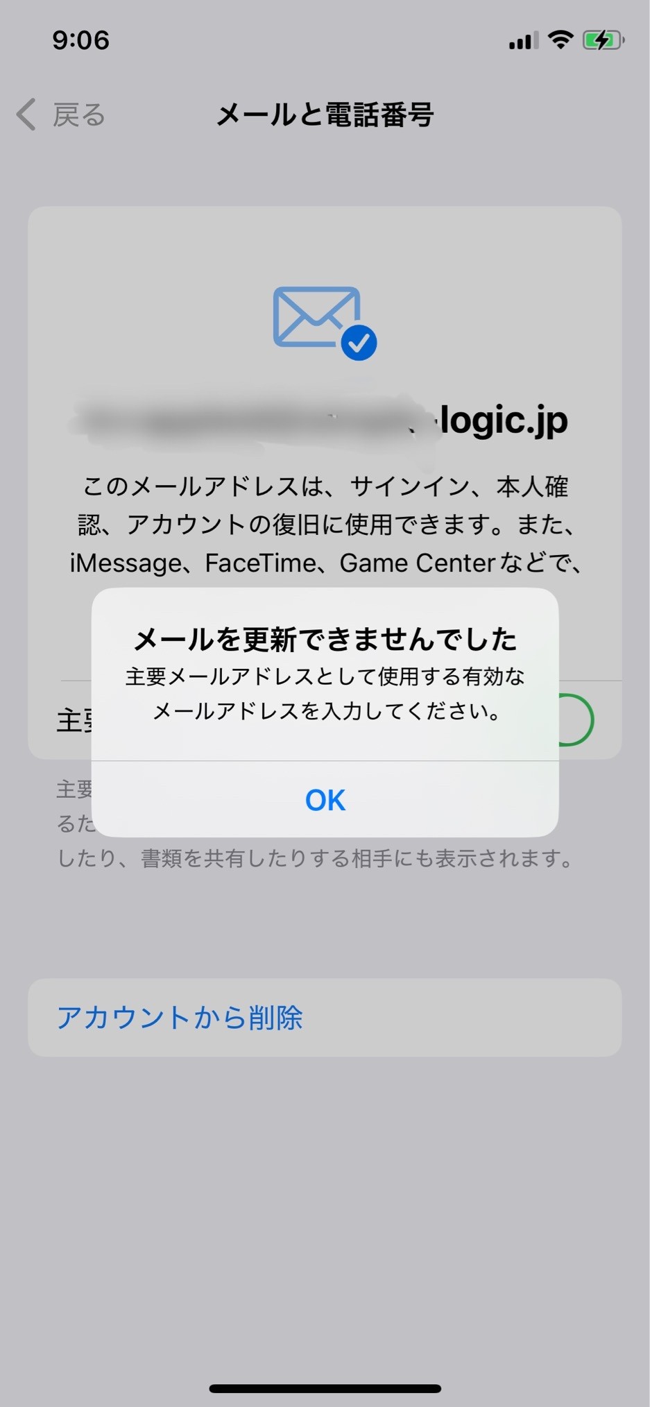 仕方ないので、試しに別に必要もないicloud.comでメールアドレス作って、そちらを主要メールにしたのですがそれでもだめですね。