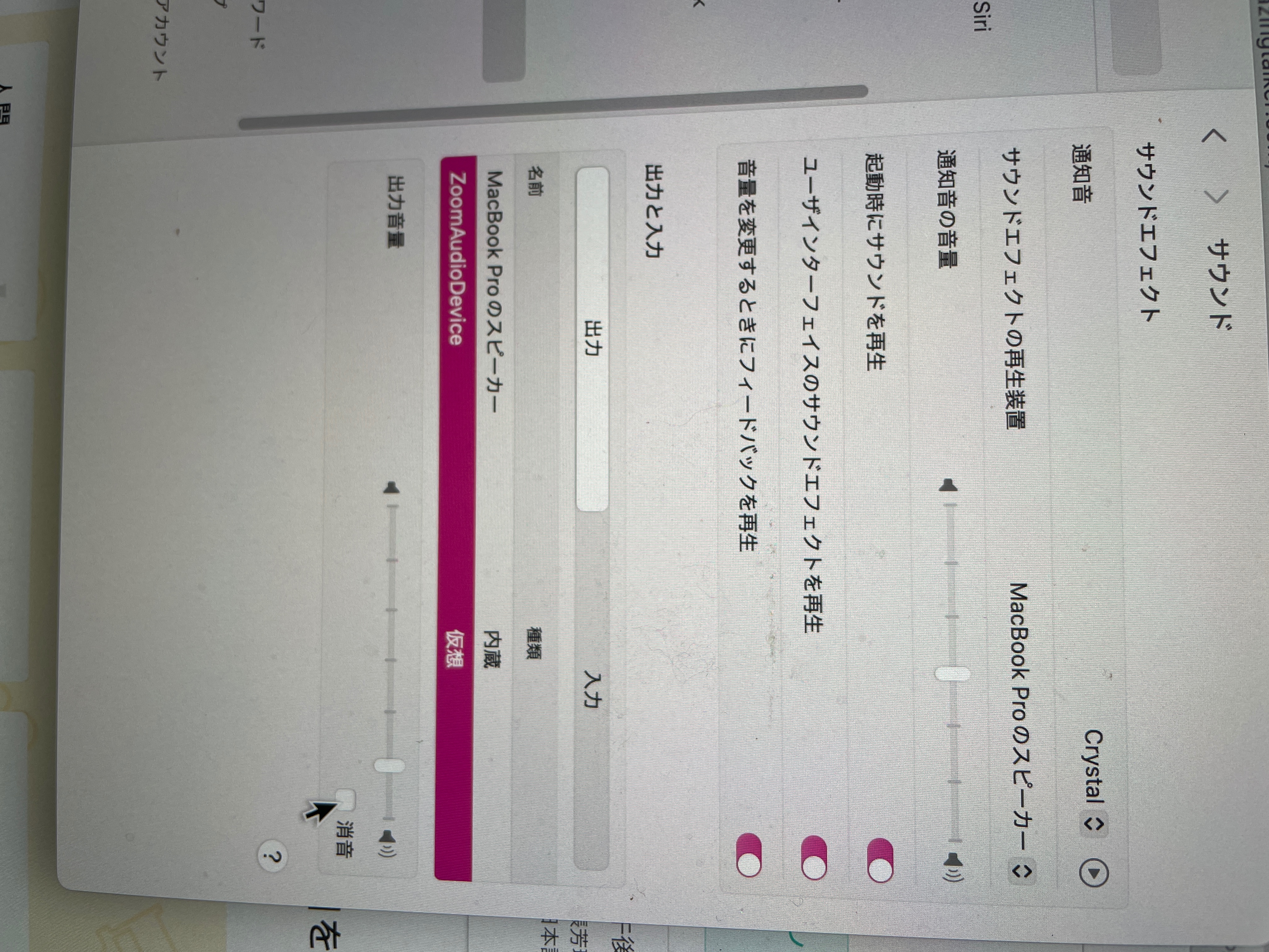 Zoomの画面共有時に「コンピュータの音声を共有する」にチェックを入れているときって 「ZoomAudioDevice」という仮想チャンネルが一時的に追加されて これが選択されている限りはZoom参加者に音声が届く感じです でも聞こえづらい音になります 他方でMacBook Proのスピーカーを選び直しますと音質は元に戻りますが PCの音がZoomに行かなくなるので自分しか聞こえなくなります
