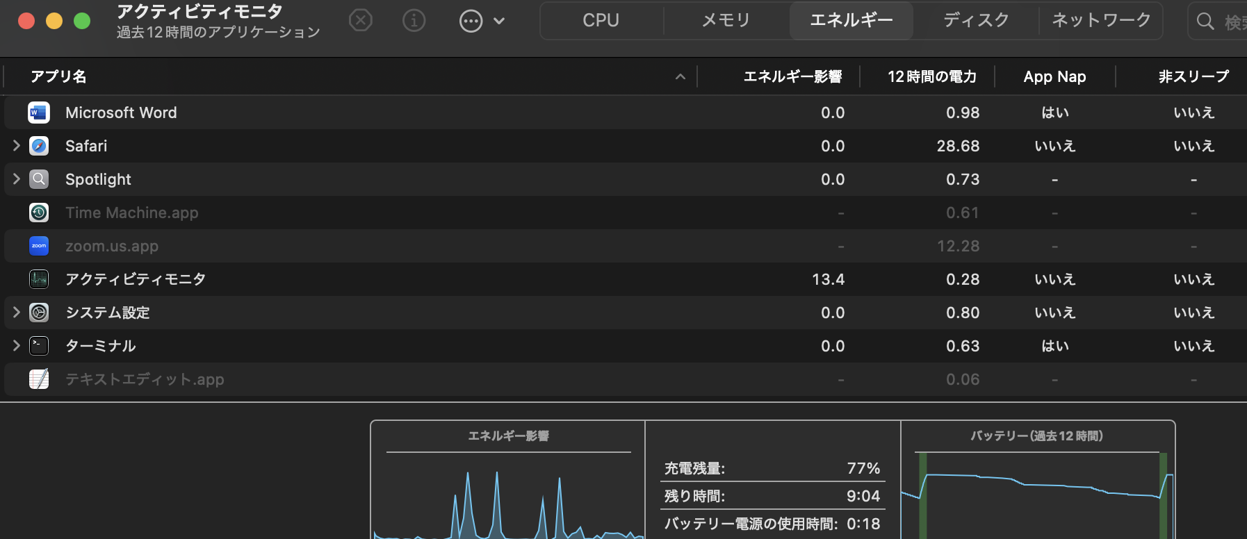 → アプリケーション > ユーティリティー > アクティビティモニタ アプリを開き 画面上部のエネルギータブを選びます